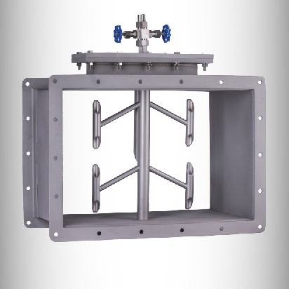 工业现场大口径气体流量计安装处,由于空间所限直管段长度不够是普遍现象,这时管道内旋转流及流速分布严重畸变,流量计仪表系数产生很大偏移,非圆截面(矩形、多边形等)管道内流速分布更加复杂,并且大小管道并不具备相似性,给流量测量带来很大的困扰,我公司生产的多点矩阵流量测量装置,通过把整个管道截面分成N个等面积单元,流量传感器上设总压孔,总压孔的位置正好处于每个单元面积的中心位置,所测总压即反映了各个单元面积的流速大小,并在流量传感器中将各点总压平均后,和位于传感器背流方向轴线位置的静压检测口测得的静压,分别引出流量传感器,形成差压输出,差压开方与流量存在线性关系。