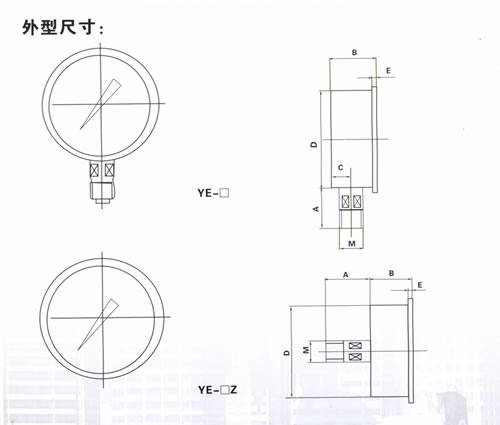 膜盒压力表适用测量对铜和铜合金无腐蚀性气体或液体介质的微小压力。技术参数:型号结构形式测量上限KPa准确度%YE-100YE-100Z径向无边轴向无边4;6;10;16;25;40;60;-4-0;
